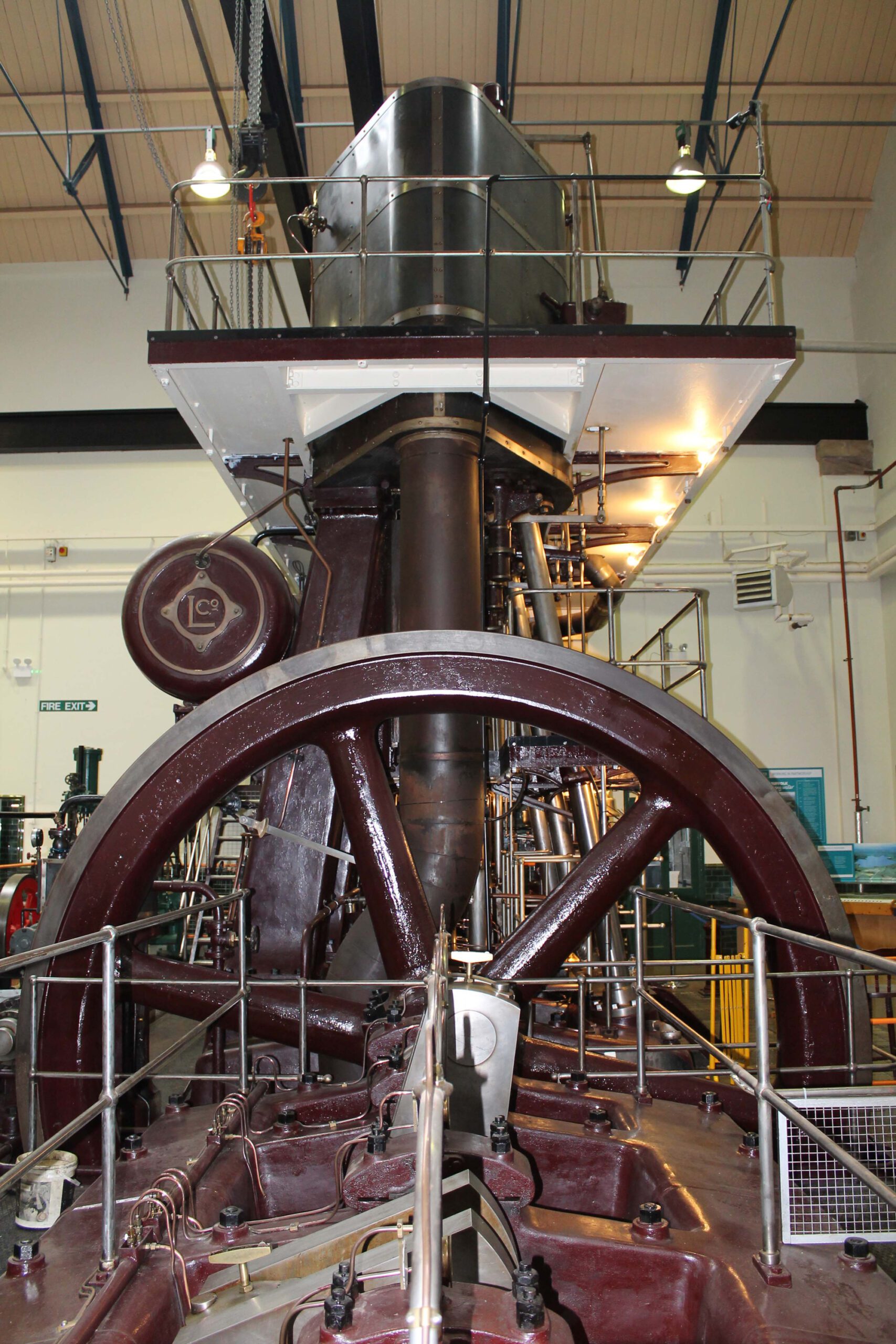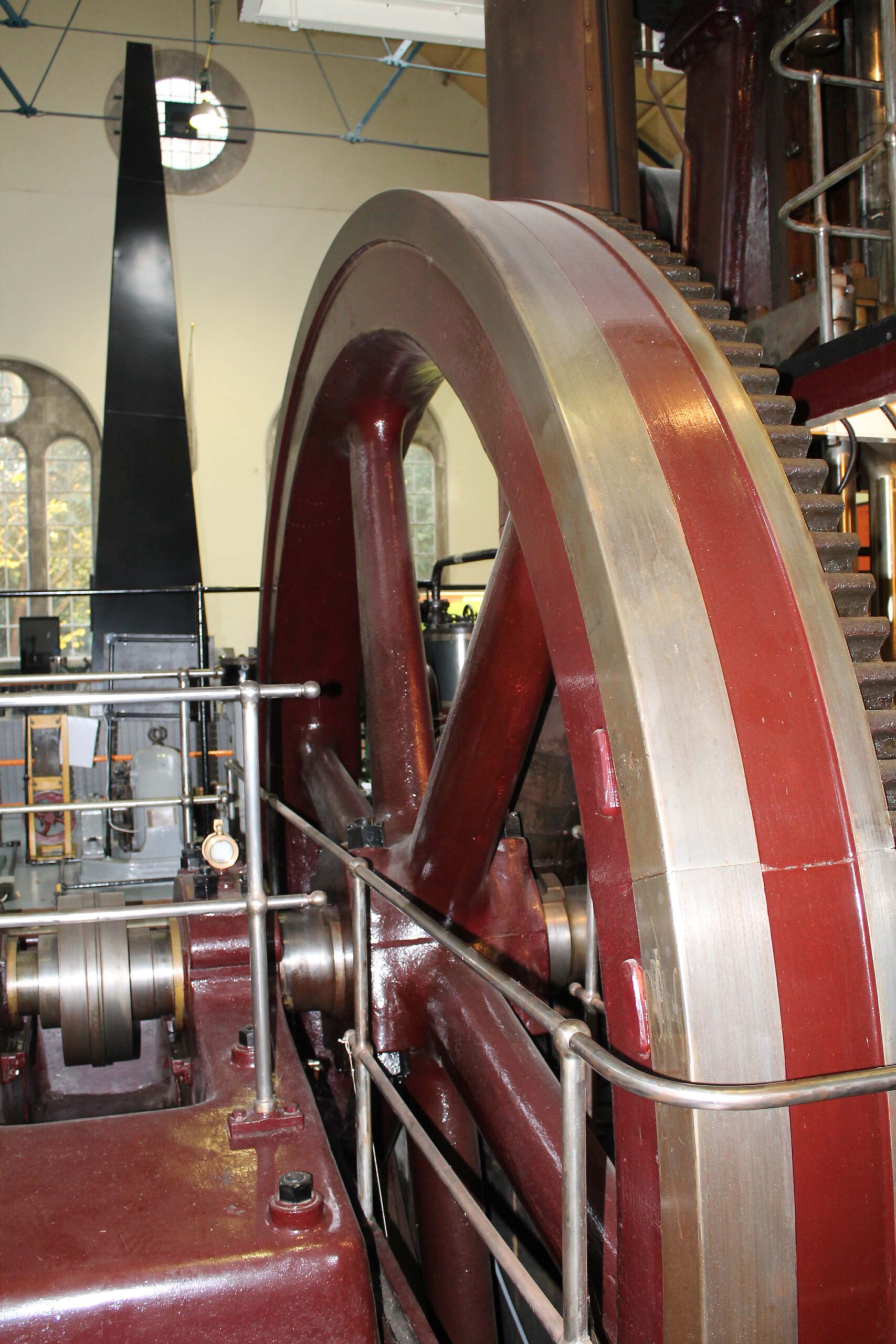 All steam cylinders are steam-jacketed to reduce heat loss and condensation and thus improve efficiency. The cylinders, steam pipes and reheater were lagged with asbestos, which was removed in January 1997. The flywheel is 14 feet (4,267 mm) diameter and weighs 18 tons (18.29 tonnes).